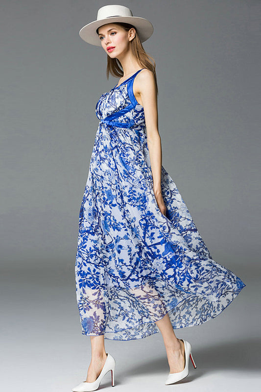 Casual Chiffon Floral Printed Slim Long Maxi Dress With Belt
