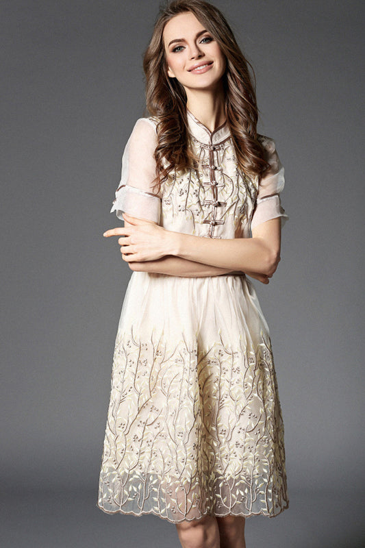 Chi-pao Stand Collar Floral Embroidery Organza Dress