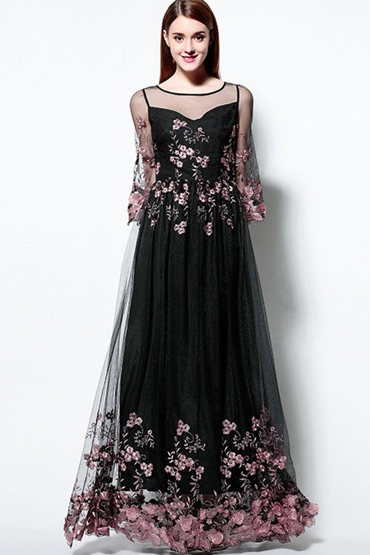 Embroidered With Rosette Illusion Long Cocktail Dress