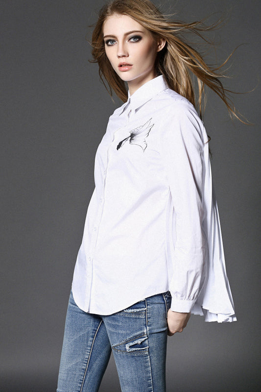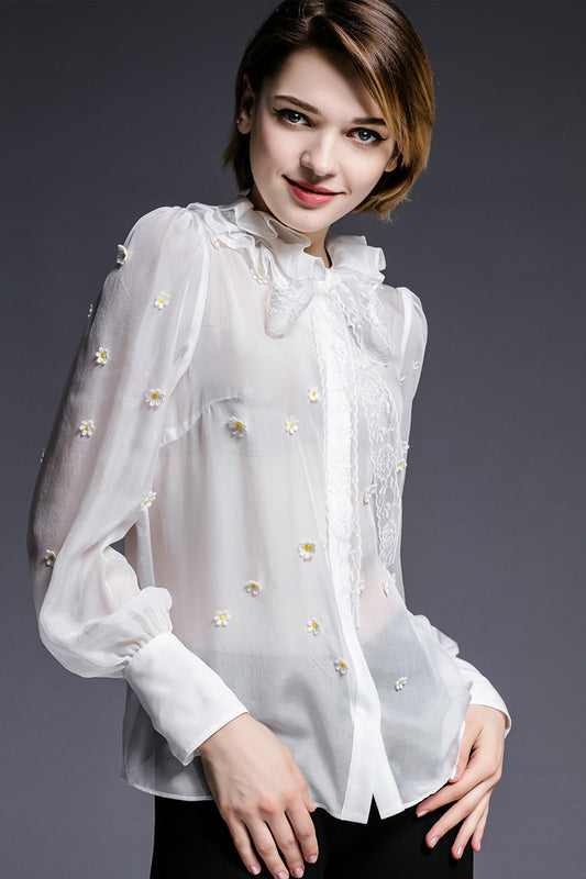 Flare High Collar Flowers Embroidered Lattern Sleeve Chiffon Blouse