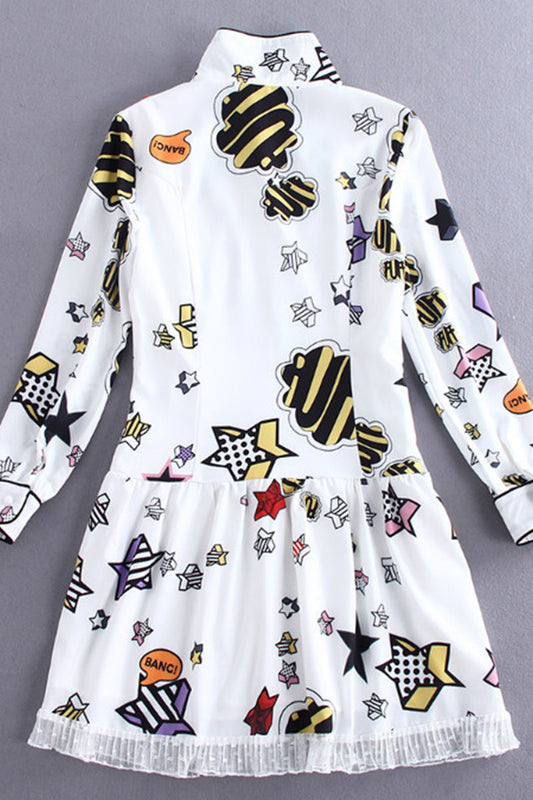 V Neck Cartoon Print Lace Hemline Pleated Dress