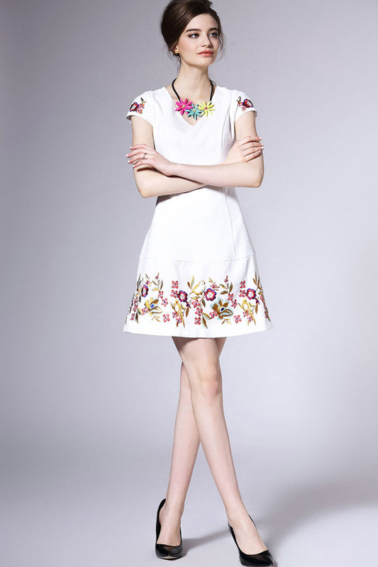 V NECK A-LINE CAP SLEEEVE EMBROIDERY FLOWER CASUAL DRESS