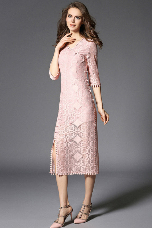 V Neck Full Lace Slim Wrap Side Slit Chi-Pao Dress