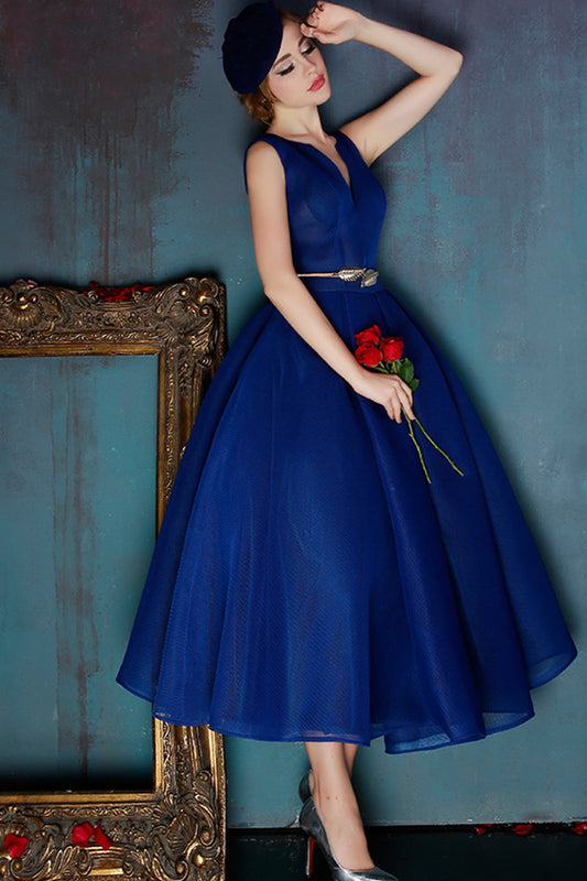 V-Neck Embroidered Mixed Bead Illusion Shrring Pleated Cocktail Dress