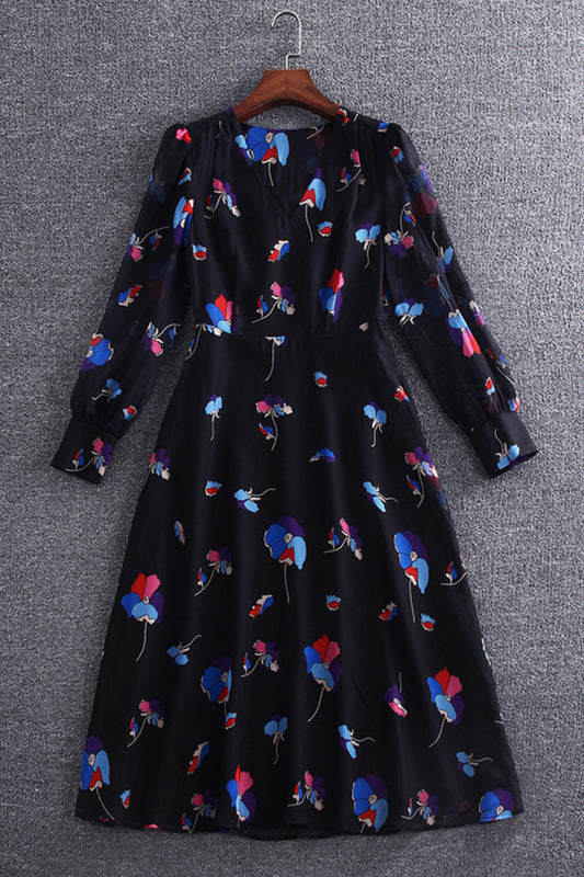 V-Neck Puff Sleeve Flower Printting Chiffon Dress
