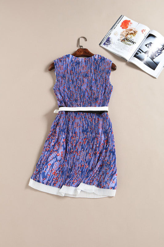 V Neck Sleeveless Pleated Vacation Short Dress With Belt
