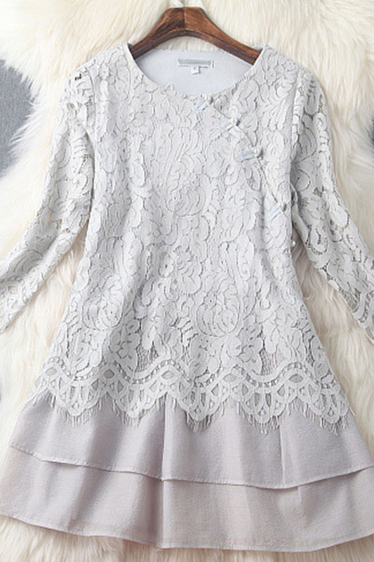WOMEN'S CASUAL H-LINE ROUND NECK LACE SHEER MESH KINT DRESS