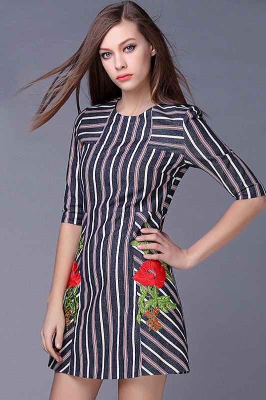 WOMEN'S SLIM FORMAL HALF SLEEVE STRIPE EMBROIDERY ROUND NECK DRESS