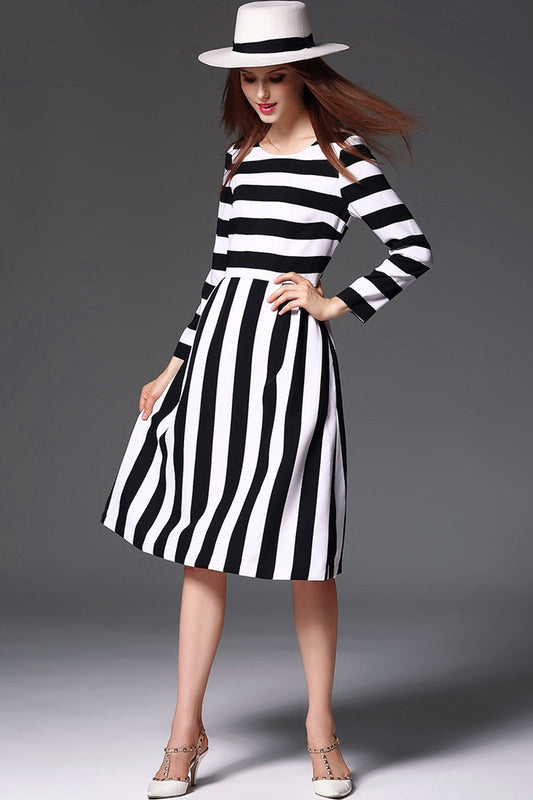 Women's Slim Boat Neck Striped 9 Sleeve Elegant Dress