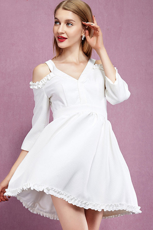 [30% OFF TILL 8 APR] Elegant V Neck Irregularity Hollow-Out Sleeve Patched Mini Dress
